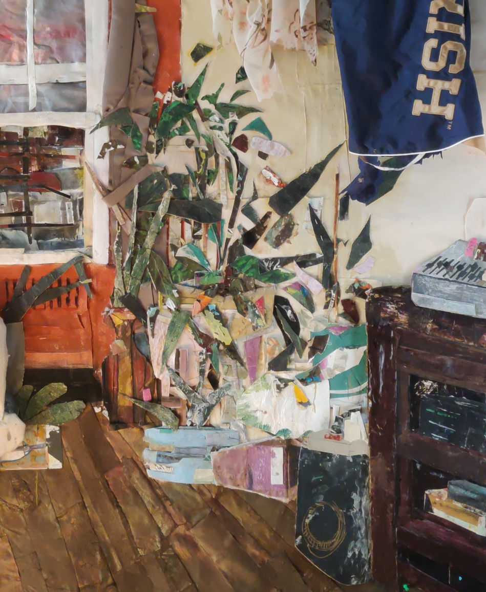 Recycled fabric, dried paints, oil, acrylic, rope, and paint marker on panel