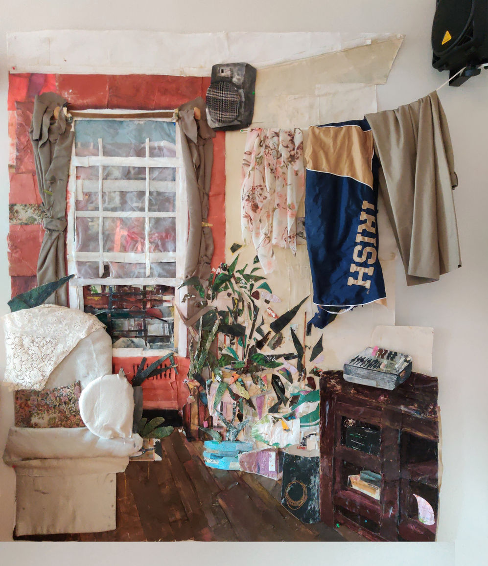 Recycled fabric, oil, acrylic and spray paint